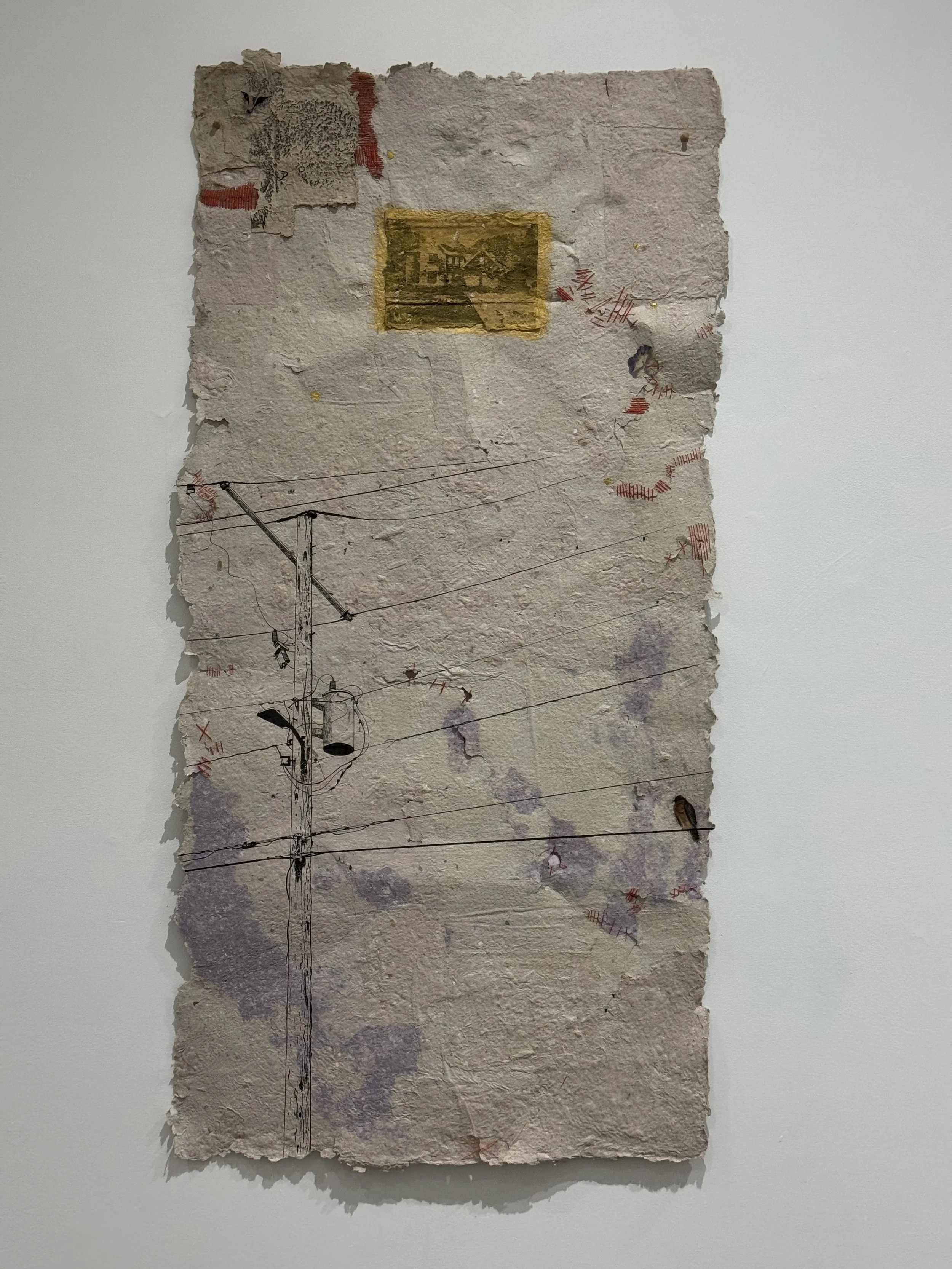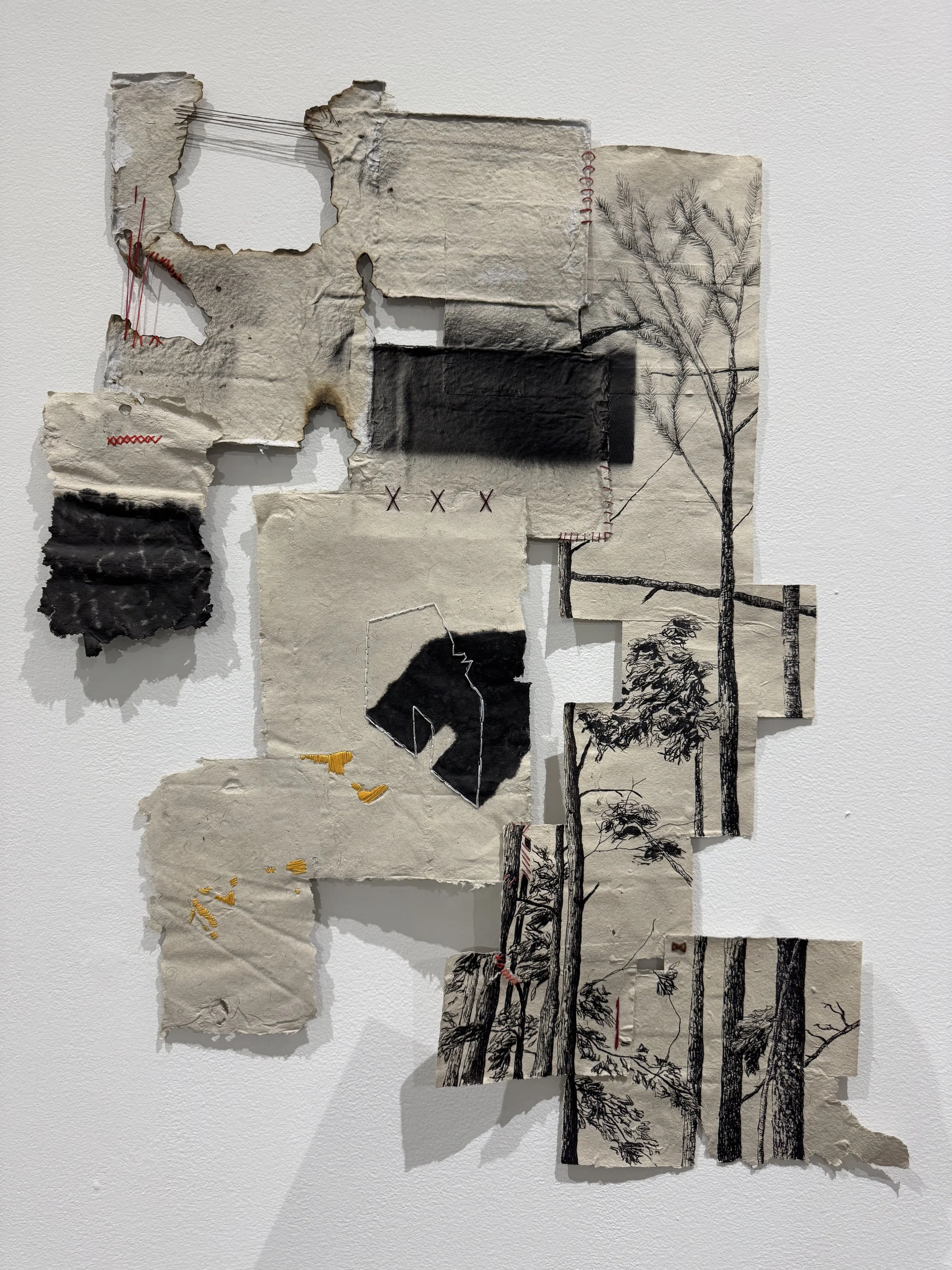 handmade paper, thread, spray paint, ink, charcoal, fire.