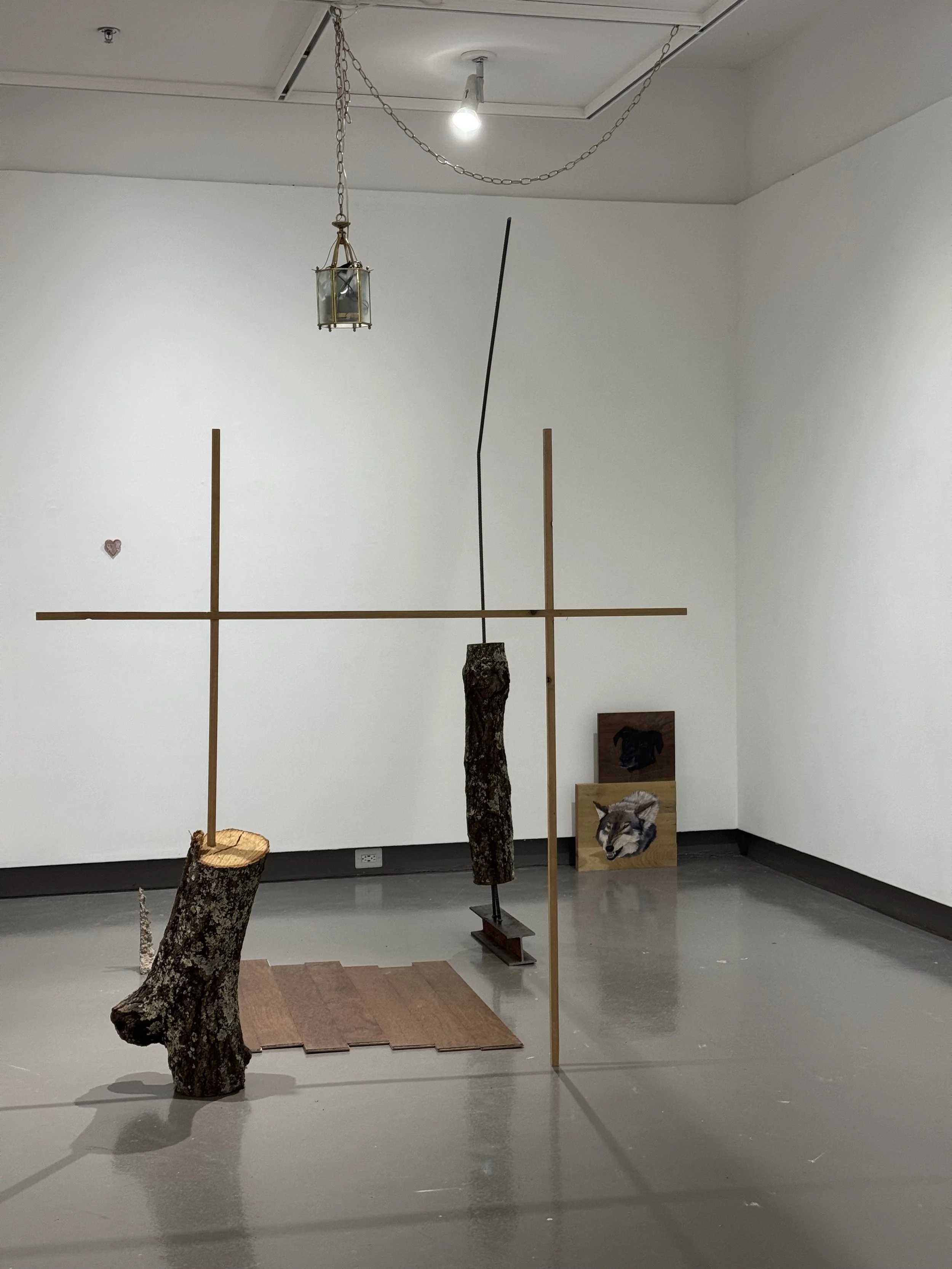 oak log, I beam, rebar, cedar, chandelier, cast paper, speaker, flooring