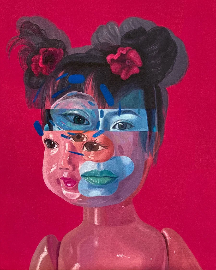 That is why Huang used perfect pure China dolls or distorted self in her works, which is another reason because she is half Chinese. Her mom’s friends used to say to her, “Just like a doll,” which made her shy. She said that one day, I put my hands on my face and said, “No doll!” This is where her show's title came from. It has been a long story, I would say a lifetime story, and maybe her experience of being among women, and perfect. Without asking questions, we never know which event made us today’s self. It is so deep, but seeing these contemporary works with big canvases, vibrant oils, and such a visual feast is also good.